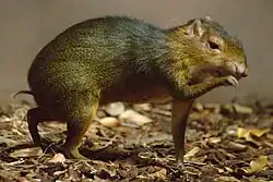 The green acouchi (Myoprocta pratti) is a species of rodent in the acouchi genus, part of the family Dasyproctidae. It is found in western Amazonia, west of the Rios Negro and Madeira, in northwestern Brazil, northeastern Peru, eastern Ecuador, southeastern Colombia, and southern Venezuela. There is substantial variation within this range, and the Green Acouchi, as currently recognized, may contain more than one species. Because the application of the scientific name acouchy, currently in use for the Red Acouchi, has historically been disputed, the name Myoprocta acouchy has sometimes been used for this species instead of Myoprocta pratti.[3] The species is named for Antwerp Edgar Pratt who was a British naturalist.[4]