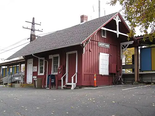 Station house, seen from northwest, Green's Farms (Metro-North station) in the Greens Farms section of Westport, Connecticut.