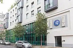 Apart from the George and Dragon, all the buildings in the street are modern, being made up on the northern side of Fitzrovia House on the corner with Cleveland House, the flats known as Whitson Court, and on the corner with Bolsover Street the new Royal National Orthopaedic Hospital Trust Outpatient Assessment Centre which opened in 2009.[8] This last features, on the Greenwell side, relief sculptures of a boy holding a cricket bat and a girl with flowers which were salvaged from above the main entrance in Bolsover Street when the original hospital was demolished in 2007-08.[8][9]