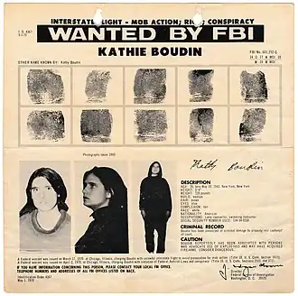 The search for bodies continued for nine days after the explosion, and at Seedman's suggestion Wilkerson's parents made a televised appeal to their missing daughter to avoid needlessly risking the lives of searchers. They asked her to "let us know how many more people, if any, are still left in the ruins of our home", saying "more lives would be needlessly lost and only you have the key".[7] Wilkerson did not respond to the appeals. Fingerprint records were required to identify the dismembered remains of Gold, a leader of the Columbia University protests of 1968, and Oughton, the organizer of the 1969 SDS national convention.[16][17][18][19] Rumors circulated among leftists that the third body was that of Robbins, a leader of the 1968 Kent State University student rebellion and a founder of the Weathermen, who would be indicted the following month along with 11 others for organizing and inciting riots during the Days of Rage.[20]