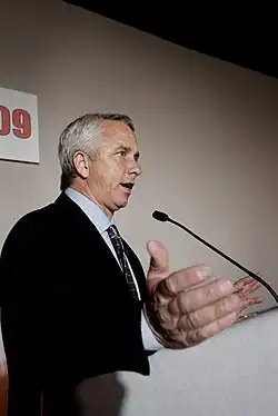 In 2001 LeMond was one of the first professional cyclists of note, and the only former Tour champion, to openly express doubts over the legitimacy of Lance Armstrong's three-consecutive Tour successes.[5][6][7] He consistently questioned the relationship between riders and sports doctors like Italian Michele Ferrari. In 2006 LeMond noted that the extent of doping in the sport could not occur without complicity from the body that regulates international professional cycling, and he accused the Union Cycliste Internationale of serious doping-related corruption.[8][9] In an open letter in December 2012 he asserted that UCI's Pat McQuaid and Hein Verbruggen were central to the problem in professional cycling.[10] LeMond claimed professional cyclists are treated as "lab rats," while the doping facilitators escape harm or responsibility. He told an audience at Coventry University, "The doctors, the management, the officials, they're the ones that have corrupted riders. The riders are the only ones that pay the price".[8] LeMond's statements have brought him into conflict with some of the sport's elite, including the UCI's McQuaid and Verbruggen, the Trek Bicycle Corporation,[11] and riders Lance Armstrong,[12] Floyd Landis, and Alberto Contador. In the interests of reforming the sport, LeMond offered to serve as president of the UCI, taking over the position of former president Pat McQuaid.[13][14]