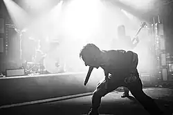 He and the Dillinger Escape Plan repeatedly joined the stage with Nine Inch Nails during their 2009 Wave Goodbye Tour in North America, and in Australia (both with the Dillinger Escape Plan, and solo, performing the songs "Wish" and "Mr. Self Destruct").[21][62] On November 19–20, 2009, as part of the Chi Cheng benefit show at the Avalon Hollywood, he sang the Deftones songs "Passenger" and "Hexagram", both with Chino Moreno, as well as the Metallica classic "Battery" alongside members of Deftones, Metallica, System of a Down and Children of Bodom.[63][64][65] He performed "Passenger" again most nights on the 2011 Deftones/Dillinger Escape Plan North American tour.[66][67][68][69] On May 4, 2015, Puciato and Andrew Kline of Strife were invited on stage by Cavalera Conspiracy in Los Angeles for a cover of "Pay to Cum" by the Bad Brains.[70]