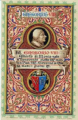 Pope Gregory VIII (Latin: Gregorius VIII; c. 1100/1105 – 17 December 1187), born Alberto di Morra, was head of the Catholic Church and ruler of the Papal States for two months in 1187. Becoming Pope after a long diplomatic career as Apostolic Chancellor, he was notable in his brief reign for reconciling the Papacy with the estranged Holy Roman Empire and for initiating the Third Crusade.