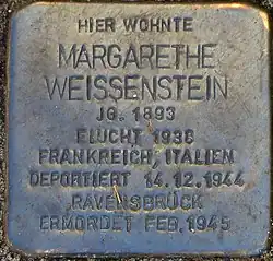 Margarethe Weissenstein was the oldest of three daughters of the Jewish couple Else and Emanuel Weissenstein. Her father was general director of the Vereinigte Jutefabriken in Vienna and Budapest. She studied in Munich, married Giulio De Francesco, an engineer from the South Tyrolean Rovereto, lived with him in Milan, then since the mid-twenties in Berlin, where she became the first female graduate at the Deutsche Hochschule für Politik with her diploma thesis "The Face of Italian Fascism" (1931). She wrote features for the Frankfurter Zeitung and was in contact with Walter Benjamin, Ernst Bloch, Siegfried Kracauer, Karl Mannheim and Albert Salomon. In 1932 she was a member of the editorial board for a short time, afterwards she wrote as a freelancer, partly also under the pseudonym Anton Pacher and continued to provide contributions to the paper. From 1933, she lived as a permanent border crosser between Vienna, Prague, Paris, Basel, Zurich and Milan, which had been under German occupation since September 1943. She was spied on and sought refuge in Upper Italian mountain villages, and she hid for several months in a madhouse for women, but then returned to her Milan apartment, where she was arrested by the SS in October 1944. Through the Bolzano transit camp she was deported to the Ravensbrück concentration camp in December 1944, where she was probably killed in February 1945.[1][2]