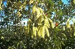 Grevillea glauca, commonly known as bushman's clothes peg, cobblers peg tree, beefwood tree,[3] nut wood, nalgo, or kawoj in New Guinea,[4] is a species of flowering plant in the family Proteaceae and is native to Papua New Guinea and north-eastern Queensland. It is an erect, spindly shrub or small tree with narrowly egg-shaped to elliptic leaves, and cylindrical clusters of cream-coloured to greenish-white flowers.