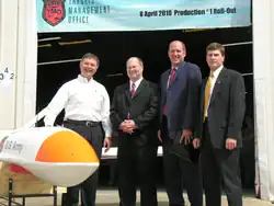 BroadSword aircraft next to Griffon Aerospace owner Larry A. French (left) during the BroadSword rollout