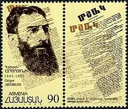 Grigor Artsruni (also spelled as Krikor Ardzruni, Armenian: Գրիգոր Արծրունի; 27 February 1845 – 19 December 1892) was an Armenian journalist, critic, writer and public activist. In 1872, he began publishing the newspaper Mshak and remained its editor and manager until his death.
