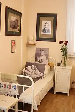 The clinic was not the most expensive in the city, but a month's treatment cost 150 rubles, a significant amount for that time.[48][49] According to the charter, Klyachkin could admit indigent patients free of charge at his discretion, for which one free bed was allocated in the general ward. Due to Tuqay's condition, he was placed on the ground floor in a single room with two windows overlooking Molochny Lane. Unlike hotel rooms, it was a warm, bright room with a high ceiling, running water, a faience washbasin, and a toilet. Tuqay had a bed with pillows and a blanket, linens, pajamas, a flannel robe, towels, slippers, and clean dishes. He was fed three times a day and cared for by orderlies and nurses.[9][21] For consultations, Klyachkin invited his doctor friends from nearby streets:[22][21] Luria agreed to be Tuqay's attending physician,[50] while Elinson treated his eyes.[22]