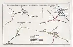 Originally single line, a passing loop was added in 1887. Built in a cutting, the main station buildings were next to the road above, with the booking office on the main platform. Like most of the others on the line, the platforms were staggered, both accessible by cart tracks.[2]