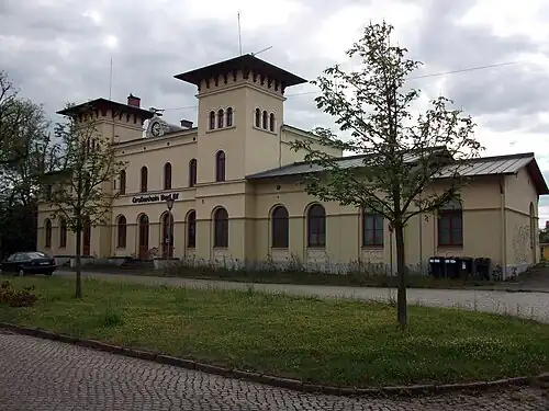 Großenhain Berliner Bahnhof[3] is a railway station in the municipality of Großenhain, Saxony, Germany. It lies on the Dresden-Friedrichstadt-Elsterwerda railway line and the connecting line to Großenhain Cottb Bf, which branches off here. Since 2002 the scheduled rail traffic at the railway station has been discontinued in favour of Großenhain Cottbuser Bahnhof, which is located closer to the city.