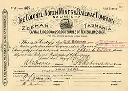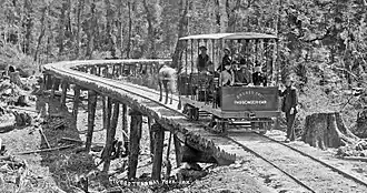 Grubb's Tramway was a more than 4 miles (6.4 km) long horse-drawn light railway in Western Tasmania. It was opened in 1891 from Zeehan to Summit and the Colonel North Mine. It became the Colonel North Tramway in 1899 and closed in 1927.[2][3][4][5] Three times a day, a "Goods Truck" carrying passengers ran every day (Sundays excepted). The uphill journey lasted at least 90 min or more.[1] The return journey from the hill summit to Zeehan, a distance of 2.150 miles (3.460 km), was accomplished in six minutes.[6]