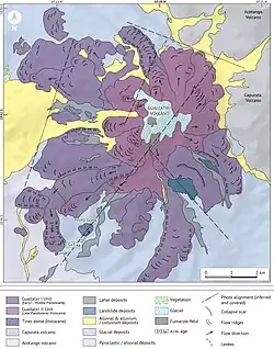 Jorquera et al. in 2019 described a two-stage growth of the volcano. Initially, the "Guallatiri I" stage grew in the form of andesitic and dacitic lava flows as well as heavily eroded pyroclastic deposits, which crop out around the volcano. Then the dacitic "Guallatiri II" developed in close proximity to the central vent; unlike the "Guallatiri I" units it has not been eroded by glaciation and flows still display flow structures.[39] The central sector of the volcano is mainly of Holocene age while the peripheral parts date to the Pleistocene.[38] In 2021, Sepúlveda et al. envisaged six[i] separate stages,[73] rocks from the first four crop out mainly at the periphery of the volcano and the last two in its central sector. All these units were erupted by the central vent of Guallatiri.[33] Some lava flows are well preserved, while others have been glaciated.[39]