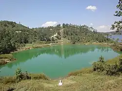 Border between Guatemala (left) and Mexico (right), in Lagunas de Montebello National Park, delineated by cleared trees and a white border marker.