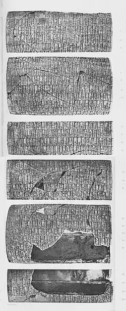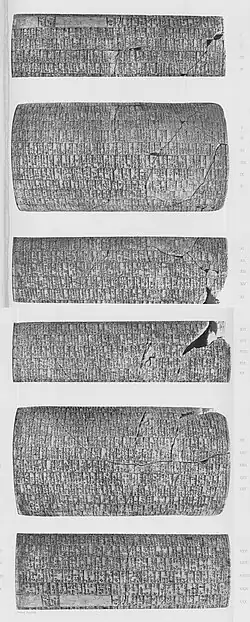 Detailed reproductions of the cylinders were made by Ernest de Sarzec in his excavation reports which are still used in modern times. The first translation and transliteration was published by Francois Threau-Dangin in 1905.[6] Another edition with a notable concordance was published by Ira Maurice Price in 1927.[7] Further translations were made by M. Lambert and R. Tournay in 1948,[8] Adam Falkenstein in 1953,[9] Giorgio Castellino in 1977,[10] Thorkild Jacobsen in 1987,[1] and Dietz Otto Edzard in 1997.[11][12] The latest translation by the Electronic Text Corpus of Sumerian Literature (ETCSL) project was prepared by Gábor Zólyomi with legacy material from Joachim Krecher.[13] Samuel Noah Kramer also published a detailed commentary in 1966[14] and in 1988.[15] Herbert Sauren proposed that the text of the cylinders comprised a ritual play, enactment or pageant that was performed during yearly temple dedication festivities and that certain sections of both cylinders narrate the script and give the ritual order of events of a seven-day festival.[16] This proposition was met with limited acceptance.[17]