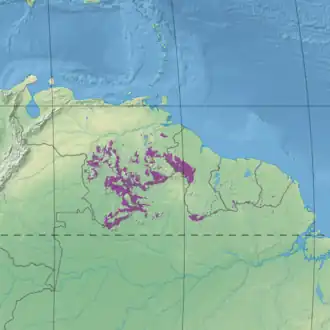The ecoregion includes parts of southern Venezuela, western and southern Guyana and northern Brazil, with scattered portions in Suriname and French Guiana.[1] It extends into eastern Colombia.[2] It has a total area of 33,747,545 hectares (83,392,000 acres).[3] The ecoregion lies on the Guiana Shield, an ancient upland area between the Amazon and Orinoco basins. It is surrounded by lowland grassy savannas and lowland forest.[3] All areas of the ecoregion contains enclaves of the Pantepuis ecoregion on the tops of table mountains.[4]