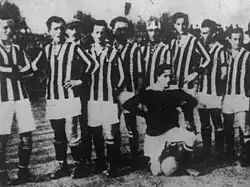 ![]() A FBC Juventus lineup in the 1920-21 season. From the left, standing: Giuseppe Giriodi, Antonio Bruna, Guido Debernardi, Osvaldo Novo, Carlo Bigatto, Guido Marchi, Piero Gilli, Giuseppe Grabbi (plus Costa and Pio Ferraris, out of the picture); accosciato: Giuseppe Giacone. | |||