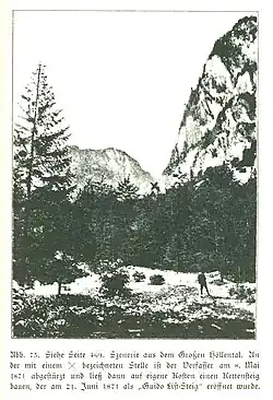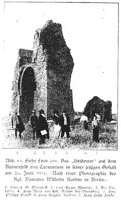 Although List wanted to become an artist and scholar, he reluctantly agreed to his father's insistence that he enter the family's leather goods business.[3] During his leisure time he devoted himself to writing and sketching as well as rambling, riding, or rowing in the countryside, becoming both a member of the Viennese rowing club Donauhort and the secretary of the Austrian Alpine Association (Österreichischer Alpenverein).[6] He was involved in both solitary and group expeditions into the Austrian Alps, and it was on one of the latter journeys that he left his mountaineering group to spend Midsummer night alone atop the Geiselberg hillfort.[4] On 24 June 1875 he and four friends rowed down the Danube before camping for the night at the site of the ancient Roman fortification of Carnuntum to commemorate the 1500th anniversary of the Battle of Carnuntum, in which Germanic tribes defeated the Roman Army. List later claimed that while his friends caroused, he celebrated the event with a fire and by burying eight bottles of wine in the shape of a swastika beneath the arch of the monument's Pagan Gate.[7]
