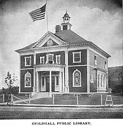 After Guildhall was chartered, a small group of settlers built temporary cabins and camps and began to clear the land.[9] As the population began to grow, the first recorded town meeting took place in 1783.[9] Guildhall is heavily wooded, as are several other towns in Essex County, and lumbering was once a major portion of the local economy.[9] The Guildhall Village Historic District was listed on the National Register of Historic Places in 1980.[10] The district includes Guildhall's village center and encompasses the central common and several nearby buildings.[10]
