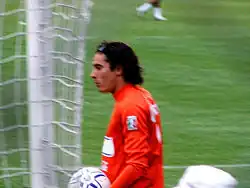 He made his 2010 World Cup qualification debut on 28 March 2009 against Costa Rica, eventually playing the majority of the qualification matches.[86] Ochoa was included in Mexico's roster for the 2009 CONCACAF Gold Cup, where he started in every match. In the semi-final against Costa Rica, the game was taken into a penalty shoot-out following a 1–1 draw. Ochoa would block Costa Rica's third attempt during the shoot-out, winning the series 5–3 and winning the man of the match award.[87] As Mexico won the final against the United States with a score of 5–0,[88] he was subsequently included in the All-Tournament Team.[89] Ochoa made the final 23-man cut for the 2010 World Cup, but was controversially named back-up goalkeeper to veteran Óscar Pérez by coach Javier Aguirre.[81][86]