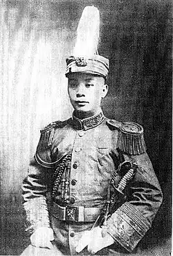 Wang had previously joined the Kuomintang (then known as the Chinese Revolutionary Party) during a 1917 visit to Shanghai. Wang was unhappy with politics in Guizhou, and many members of the Liu family complained to Liu Xianshi about his tolerance of Wang and warned him of Wang being too powerful militarily. These warnings were largely ignored by Liu. Liu did, however, have a separate military force under the command of Liu Xianqian.[9][14] Wang, as commander-in-chief, chose his subordinates based on their similar political views to him. Wang looked for people who had military training and could help him modernize Guizhou. Along with his brother Wang Boqun, Wang gathered a group of young officers from Guizhou who had studied at the Tokyo Shinbu Gakko, who had, while studying in Japan, started to support Sun Yat-sen's views.[9][14] Among these officers was He Yingqin, who would later become an important part of the Republic of China Army under Chiang Kai-shek.[9][15]