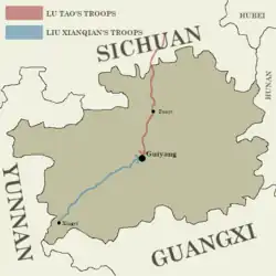 At this time, Zhong Changying, one of the leaders of the Guizhou Tongmenghui, passed through Kunming from Nanjing to return to Guizhou. When he heard the news of the invasion, he urged Cai E not to interfere in the internal affairs of Guizhou Province. Cai E, heeding the advice, ordered Tang Jiyao to divert his army's path into Sichuan and then into Hubei, but Tang Jiyao had been promised the position of governorship by the reactionary forces in Guizhou. Tang reported that his front team had entered Guizhou and was unable to change course, so they had to go deep into Guizhou. Zhong Changying chased the army in an attempt to persuade Tang Jiyao to change course, but he was assassinated in Anshun.[6][7] In early March 1912, Tang Jiyao led the Yunnan Army into Guiyang. At first, the revolutionary government was tricked into believing that Tang's forces were simply passing through Guizhou on their way to aid revolutionary forces in Central China.[8] However, aided by Liu Xianshi, Tang launched a coup against the military government and became the military governor.[5][9] He persecuted the revolutionaries. Thus, the Guizhou government fell into the hands of Tang Jiyao, the Constitutionalists, and the old bureaucrats.