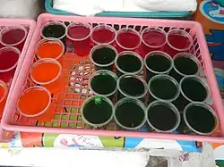 Gulaman, in Filipino cuisine, is a bar, or powdered form, of dried agar or carrageenan extracted from edible seaweed used to make jelly-like desserts. In common usage, it also usually refers to the refreshment sago't gulaman, sometimes referred to as samalamig, sold at roadside stalls and vendors.[1]