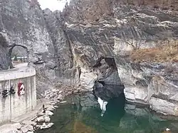 From 30000 to 70000 years ago, Hwangjicheon used to have an extremely sharp rightward bend where today's Gumunso would be, eroding the limestone. The stream formed an Ω-shaped (or horseshoe-shaped) meander and deposited well-rounded gravel with interbedded sand. Dating shows that this sedimentary layer lasted for the aforementioned years.[11] From 30000 to 10000 years ago, 40000 years of erosion has opened a small channel in through the limestone in Gumunso, reducing the flow to the meander. This was reflected by smaller pebbles being present in the deposits of that time.[12] Around 30000 years ago, the hole was fully formed, and the weakened meander disappeared completely, becoming a swamp.[13] Today, this abandoned channel consists of farmlands[14] and is called 사군다리.[6]