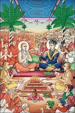 In addition to sources within their oral tradition, followers of BAPS Swaminarayan Sanstha, point to several references of Gunatitanand Swami as Akshar occurring in scriptures and texts published by the acharyas of the Vadtal or Ahmedabad dioceses.[13]: 139 One revelation of Gunatitanand Swami as Akshar occurred in 1810 at the conclusion of the grand yagna of Dabhan where Swaminarayan initiated Gunatitanand Swami as a swami. On this occasion, Swaminarayan is believed to have publicly confirmed that Gunatitanand Swami was the incarnation of Akshar, declaring, "Today, I am extremely happy to initiate Mulji Jani. He is my divine abode – Akshardham, which is infinite and endless". The first Acharya of the Vadtal diocese, Raghuvirji Maharaj, recorded this declaration in the Harililakalpataru (7.17.49-50), a scripture that he had composed.[7][13]: 138 [14] His second successor as the Acharya of the Vadtal diocese, Shri Acharya Viharilalji Maharaj, composed a series of verses in a text titled Shri Kirtan Kaustubhamala where he states, "Aksharmurti Gunatitanand Swami initiated me and guided me to practice the religious vows".[13]: 139 [27] Although certain leaders of the Vadtal diocese historically understood Gunatitanand Swami to be Akshar, over time their position on the issue has been reversed and currently they do not accept Gunatitanand Swami as Akshar. However, while the leadership of the Vadtal and Ahmedabad dioceses currently repudiate Gunatitanand Swami as Akshar, various groups within the Vadtal and Ahmedabad dioceses continue to understand Gunatitanand Swami to be Akshar.[2]: 64–68 [28]
