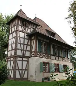 Further down Gundeldinger street is the Lower Middle Castle (Unteres Mittleres Gundeldingen). This castle was built around 1400 and was originally surrounded by a pond. In 1344 it was recorded as having been owned by Konrad Matzerer, a deceased lay brother of the nearby Saint Alban Monastery. In 1401, Agnes von Dornach combined the Lower and Upper Middle Castles into a single estate. However, after her death in 1415 the Lower Castle was inherited by the Schermann family of Basel.[3] The castle changed hands several times before it was acquired by Thomas Platter in 1549. Platter was the first rector of the Basel Gymnasium. Platter renovated and repaired the dilapidated building until his death in 1582. An exterior stair tower was added in 1674.[3] After over a century of changing ownership, in 1704 Hans Jakob Merian acquired both middle castles. After passing through several other owners, in 1842 the Lower Middle Castle was sold by the heirs of Samuel Hartmann to the city hospital.[2] It was used by the hospital until 1958 when the dilapidated building was sold to the city. Plans to demolish it were cancelled when in 1965 a committee was established to repair and maintain the building. Following a total renovation, the main building reopened in 1974. Since that time, the building has housed government and private offices.