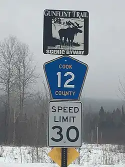 County State-Aid Highway 12 (CSAH 12), also known as the Gunflint Trail, or County Road 12 (CR 12), is a 57-mile (92 km) paved roadway and National Scenic Byway in Cook County, Minnesota, that begins in Grand Marais and ends at Saganaga Lake in the Boundary Waters Canoe Area Wilderness (BWCAW), near the U.S. border with Ontario. It provides access to many of the entry points in the BWCAW.