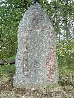 This runestone was found in the exterior wall of the church of Kullerstad in 1969 and is raised in the cemetery.[1] It informs that Håkon raised more than one memorial for his son and that he died in the West. This runestone is discussed in further detail in the article Viking runestones under Ög Fv1970;310.