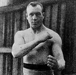 Ruhlin competed for the world heavyweight title when, in 1901, he had a rematch against champion James Jeffries. The fight ended with Jeffries' victory, in the interval between the fifth and sixth rounds, when Ruhlin gave up continuing the fight.[2] In 1902 Ruhlin again defeated Tom Sharkey.[2] In that same year Ruhlin was photographed for the book, "The Art of Boxing and Self-Defense" by Professor Mike Donovan, which depicted Ruhlin using the Cross-armed guard.[3] In 1904 Ruhlin fought to a draw and lost to Marvin Hart.[2]