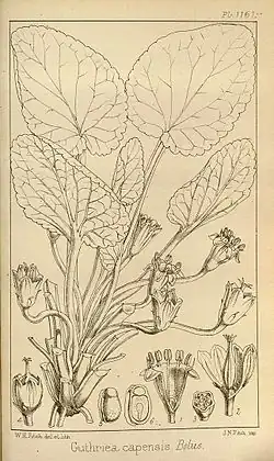 Guthriea capensis is an acaulescent perennial herb endemic to South Africa and occurring in cool and damp sites facing south or east in the mountains of the Cape Province, Lesotho and KwaZulu-Natal. Guthriea is monotypic and was named after the botanist and mathematician Francis Guthrie by his friend the botanist Harry Bolus.