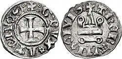 Florent died in early 1297, and an influential Achaean lord, Nicholas III of Saint Omer, convinced the widowed Isabella to propose the hand of her only daughter, Mahaut, to Guy.[18] The three-year-old Mahaut was sent to Athens, but Charles II protested against the marriage.[18] On 3 July 1299, he reminded Guy that the heiress to Achaea could not marry without his consent, and ordered Guy to return her to her mother.[18] Charles II also intervened in Guy's conflict with his mother, ordering him to restore her dower on 31 July.[19] Isabella and Guy had already approached Pope Boniface VIII to sanction Guy's marriage, because Guy and his bride's mothers were cousins.[18] The Pope granted the necessary dispensation on 9 August.[18] Being the Pope's vassal, Charles II had to accept the Pope's decision and gave consent to the marriage on 20 April 1300.[18] At Guy's request, the King had already forbidden Guy's mother to sell two towns which were part of her dowry without his consent.[19]