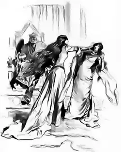 Rachel Bromwich notes, citing the spelling found in Culhwch and Olwen and Triad 84, that Gwenhwyach may in fact be the original spelling of the name.[1] Melville Richards and Bromwich previously suggested that the alternate spelling of her name in medieval Welsh sources, Gwenhwywach, could have been understood as Gwenhwy-fach, or "Gwenhwy the Lesser", a back-formation based on a false etymology of her sister's name as Gwenhwy-fawr, meaning "Gwenhwy the Great".[2][3] It is possible that Gwenhwyfach was once thought of as a darker aspect of Gwenhwyfar.[4]