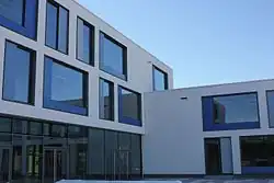 The building is on a 30 ha site that was part of the US Army Alabama Depot and then the Alabama Halle next to BMW Research and Innovation Centre. The site was landscaped by Hackl Hoffmann.[4] The building was designed and built by the architects h4a Gessert + Randecker.[5] The footprint of the building is 18.000 m2, the usable area being 10.000 m2.[6] It cost in all 65 million euro, and Freistaat Bayern contributed 8 million euro.[7]
