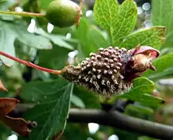 On the secondary hosts, the fungus produces yellowish depressions on the leaves. It also infects the fruit, which grows whitish tubes like a Medusa head. These are the spore tubes. The spores must then infect a juniper to complete the life cycle.