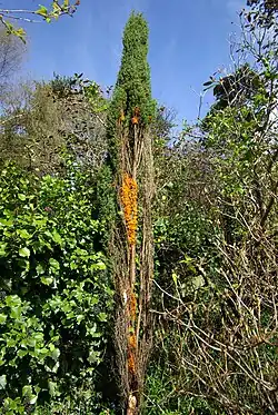 In junipers, the primary hosts, G. clavariiforme produces a set of orange tentacle-like spore tubes called telial horns. These horns expand and have a jelly like consistency when wet.[4] The spores are released and travel on the wind until they infect a hawthorn tree.