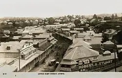 Gympie's name derives from the Gubbi Gubbi word gimpi-gimpi, which means "stinging tree"[9] and refers to Dendrocnide moroides. The tree has large, round leaves that have similar properties to stinging nettles. The city was previously named Nashville, after James Nash, who discovered gold in the area in 1867.[10] The name was changed to Gympie in 1868, after a local species of tree was found, the Gimpie-Gimpie.[11][12] Graziers were the original European settlers. Subsequently, James Nash reported the discovery of "payable" alluvial gold on 16 October 1867.[13] At the time of Nash's discovery, Queensland was suffering from a severe economic depression. Nash saved Queensland from bankruptcy. A memorial fountain in Gympie's Park honours Nash's discovery.[13] The Gympie Gold Rush Festival celebrates the event today. The Gold Rush Festival holds 10 days of cultural events in October.[14] Gold mining still plays a role in the area's fortunes, along with agriculture (dairy predominantly), timber and tourism. The gold rush's rapid development led to streets that are in an irregular fashion.[15]