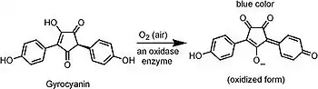 - ^ Besl H, Bresinsky A, Steglish W, Zipfel K (1973). "Pilzpigmente, XVII. Über Gyrocyanin, das blauende Prinzip des Kornblumenröhrlings (Gyroporus cyanescens), und eine oxidative Ringverengung des Atromentins" [Fungus pigments .17. Gyrocyanin, blueing principle of Gyroporus cyanescens, and an oxidative ring contraction of atromentin]. Chemische Berichte/Recueil (in German). 106 (10): 3223–9. doi:10.1002/cber.19731061012.
