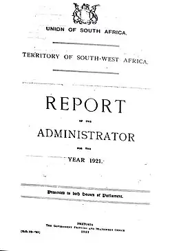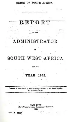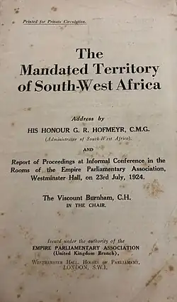 129. ^ a b c d e f g h i j k l m n o p q r s t u v w x y The Mandated Territory of South-West Africa, Empire Parliamentary Association (UK Branch), 23 July 1924