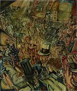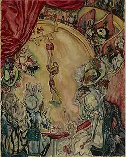 In addition to painting, he was a well-known theater set and costume designer, and also created numerous book illustrations. His series of Hungarian historical drawings were reproduced and published in an album. As a graphic artist, he also illustrated the works of Ferenc Herczeg and Cécile Tormay. His painting can be related to late Art Nouveau, his pictures are characterized by gracefully elongated figures and satirical representation. He often chose glittering, aristocratic social scenes as the subject of his paintings. He uniquely portrayed luxurious pleasure girls, elegant gentlemen, gangsters, the posing, theatrical, hollow characters of the aristocratic milieu full of sultry eroticism. In addition to Daumier, his elongated figures also remind us of El Greco's manneristic undulating depictions of people. His works are often dream-like, energetically swirling organic forms form an integral part of their design world. Its decorativeness shows affinities with the illustration of surrealism and Art Deco.[3]