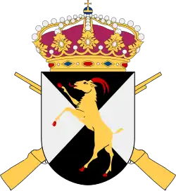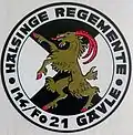 The coat of the arms of the Hälsinge Regiment (I 14/Fo 21) 1977–1997 and the Gävleborg Group (Gävleborgsgruppen) since 1997. Blazon: The provincial badge of Hälsingland, saltire sable and argent, a buck rampant or, armed and langued gules. The shield surmounted two muskets in saltire or".[6]