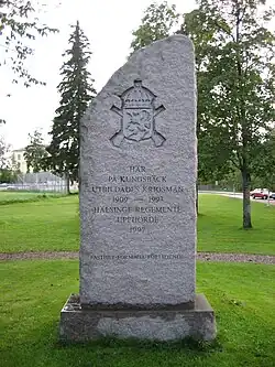 The Hälsinge Regiment memorial monument in Gävle. The inscription reads: "Here at Kungsbäck soldiers of war were trained 1909–1993. Hälsinge Regiment ceased in 1997. Solidity–Ability–Confidence."