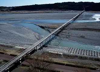 The Hōrai Bridge is on the Edo period route of the Tōkaidō, connecting Edo with Kyoto. The Tokugawa shogunate expressly forbid the construction of any bridge or ferry service over the Ōi River for defensive purposes, forcing travelers to wade across its shallows. However, whenever the river flooded due to strong or long rains, crossing the river was impossible.[3] During period of long rains, visitors were sometimes forced to stay at Shimada-juku or Kanaya-juku, sometimes for several days. Following the Meiji restoration, former samurai loyal to the Tokugawa clan settled in the Makinohara area and began to develop tea plantations.[4] To facilitate crossing the river, this bridge was built in 1879. In 1965 its wooden pilings were replaced by concrete, but its wooden top was retained.[2]