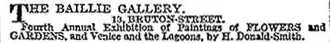 On 10 March 1909, the Baillie Gallery, which had recently moved from Baker Street to 13 Bruton Street, staged their fourth annual exhibition of flower paintings.[6] The Times described the proprietor as having "an excellent taste in art" and his exhibitions of "a fairly high standard".[6] The flower painting genre was one which had fallen into disfavour, after a high point, but which was now being revived again. 148 works were on display, under a third showing gardens and the others depicting flowers.