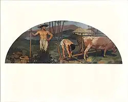 Saÿen was born in Philadelphia on 25 April 1875 to Edward M. Saÿen and Annie T. Saÿen (née Thomas). Soon after graduating from Central Manual Training School in 1891, he went to work for James W. Queen & Company, a large manufacturer of scientific equipment. He distinguished himself at the age of 18 by designing a large induction coil that was cited at the World's Columbian Exposition of 1893.[1] In 1897 he received a patent[2] for a self-regulating x-ray tube. This tube was the first of its kind to solve the problem of an unstable output caused by a drop in tube gas pressure. At the outbreak of the Spanish–American War, he volunteered for military service and was assigned to Fort McPherson, Georgia where he was put in charge of the medical x-ray laboratory. After contracting typhoid fever he was discharged from the army in 1898 and returned to Philadelphia where he resumed his work with James W. Queen & Company. The following year he enrolled in the Pennsylvania Academy of Fine Arts where he studied under Thomas Anshutz.[1] In 1903 he married Jeannette Hope, also a student at the Pennsylvania Academy of the Fine Arts.[3] In 1903 he was awarded a commission for the design of four lunettes to be hung in the United States Capitol. These lunettes, titled Rule of Tyranny, Rule of Justice, Primitive Agriculture, and Good Government were installed in Room H-143 between 1904 and 1905[1]