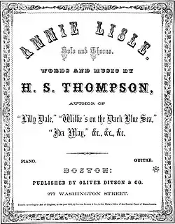 • 1857 "Annie Lisle," Moulton & Clark, Newburyport, and later by Oliver Ditson, Boston. Thompson's most famous work, it is remembered as the melody for the Cornell University alma mater "Far Above Cayuga's Waters" and other school anthems.
