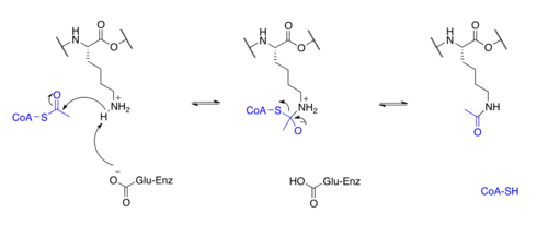 Proteins are typically acetylated on lysine residues and this reaction relies on acetyl-coenzyme A as the acetyl group donor. In histone acetylation and deacetylation, histone proteins are acetylated and deacetylated on lysine residues in the N-terminal tail as part of gene regulation. Typically, these reactions are catalyzed by enzymes with histone acetyltransferase (HAT) or histone deacetylase (HDAC) activity, although HATs and HDACs can modify the acetylation status of non-histone proteins as well.[2]