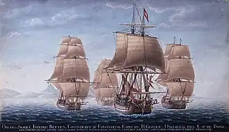 ![]() Indfødsretten flanked by the frigates Kongens af Danmark and Disklo and with the Swedish frigate Finland in the background, 1781.